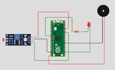 Rangkaian ini menggunakan Raspberry Pi Pico sebagai pusat kendali, yang terhubung dengan modul sensor cahaya berbasis LDR (Light Dependent Resistor). Sensor ini berfungsi untuk mengukur intensitas cahaya (lux) di sekitarnya. Sensor mendapatkan catu daya dari pin 3.3V dan GND Raspberry Pi Pico, sedangkan sinyal keluarannya dihubungkan ke salah satu pin GPIO untuk dibaca sebagai input analog atau digital. Pada rangkaian ini juga terdapat LED merah yang disambungkan ke salah satu pin GPIO melalui resistor pembatas arus, dengan katoda LED terhubung ke ground. Selain itu, buzzer dihubungkan ke pin GPIO lain dan ke ground, yang berfungsi sebagai output suara.